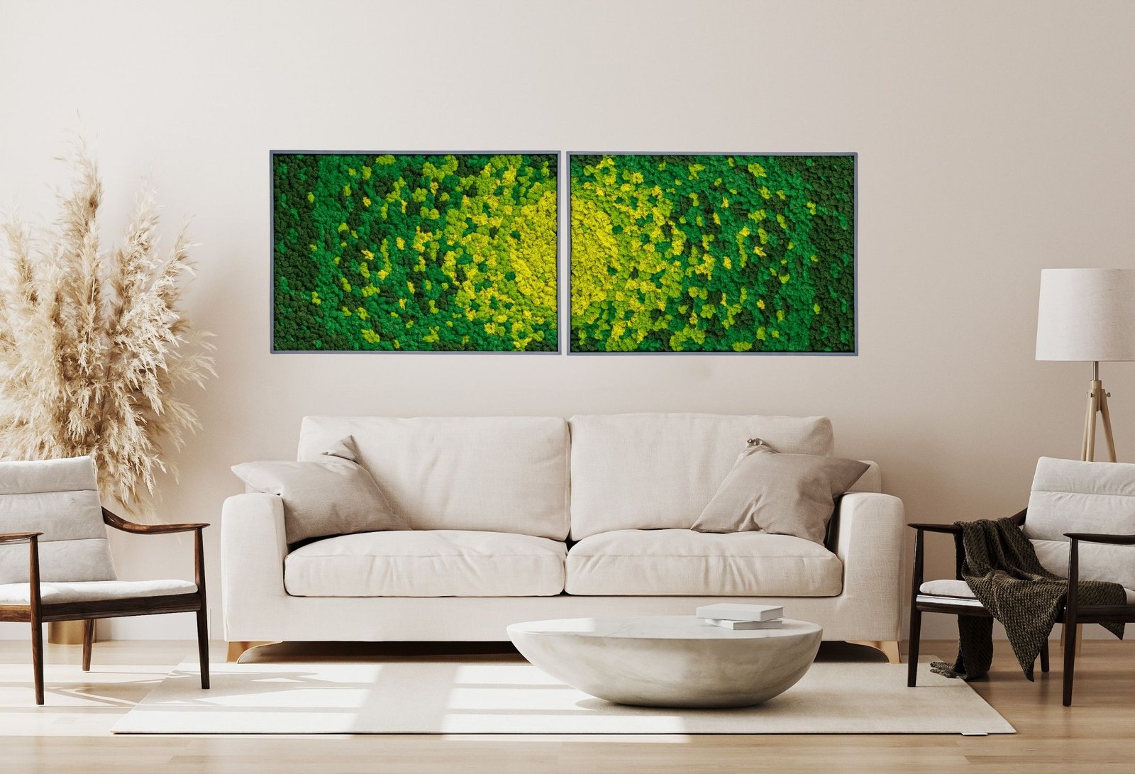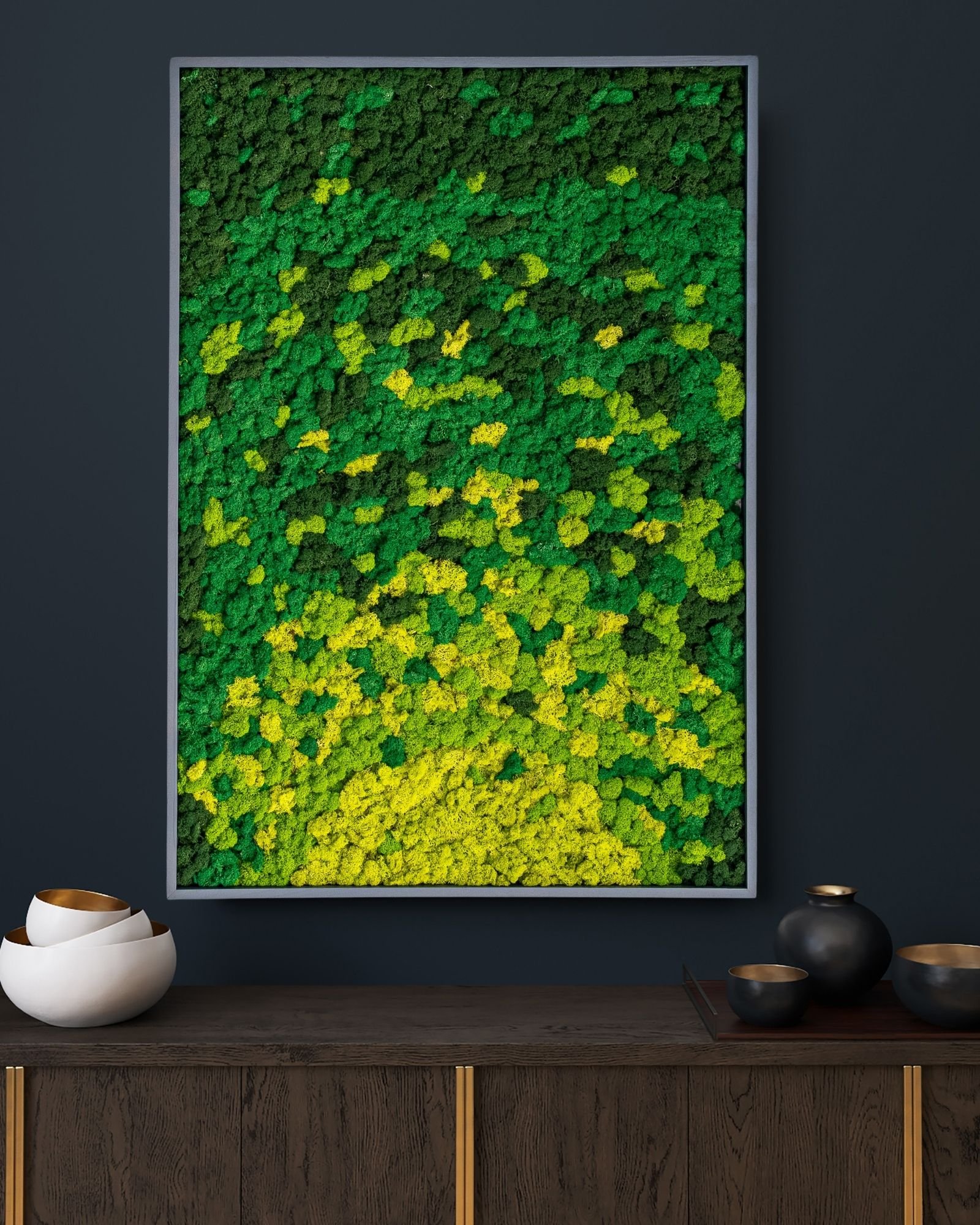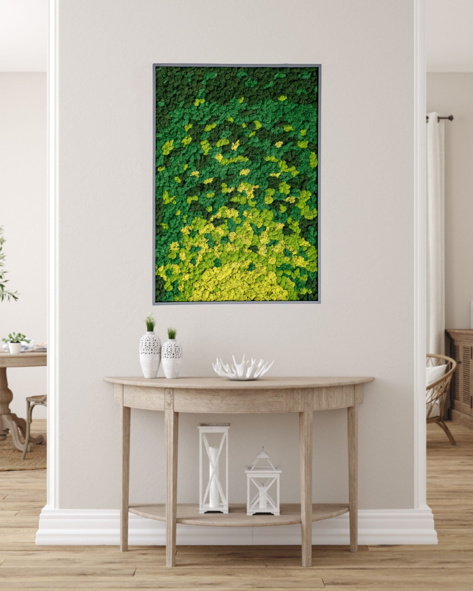 Aito poronjäkälä sisustus parantaa tilan viihtyvyyttä myös muilla aisteilla. Sammaleella on erinomaiset akustiikkaominaisuudet: sen tiheä ja huokoinen rakenne vaimentaa tehokkaasti kaikuja ja melua. Tämä tekee Sammaltaulu Vortex -teoksesta erinomaisen valinnan moderneihin koteihin ja toimistoihin, joissa on paljon kovia pintoja, kuten lasia tai betonia. Se luo rauhallisemman ja miellyttävämmän ääniympäristön, mikä vähentää stressiä ja parantaa keskittymiskykyä. Se on todellinen akustiikkataulu sammal-materiaalista.